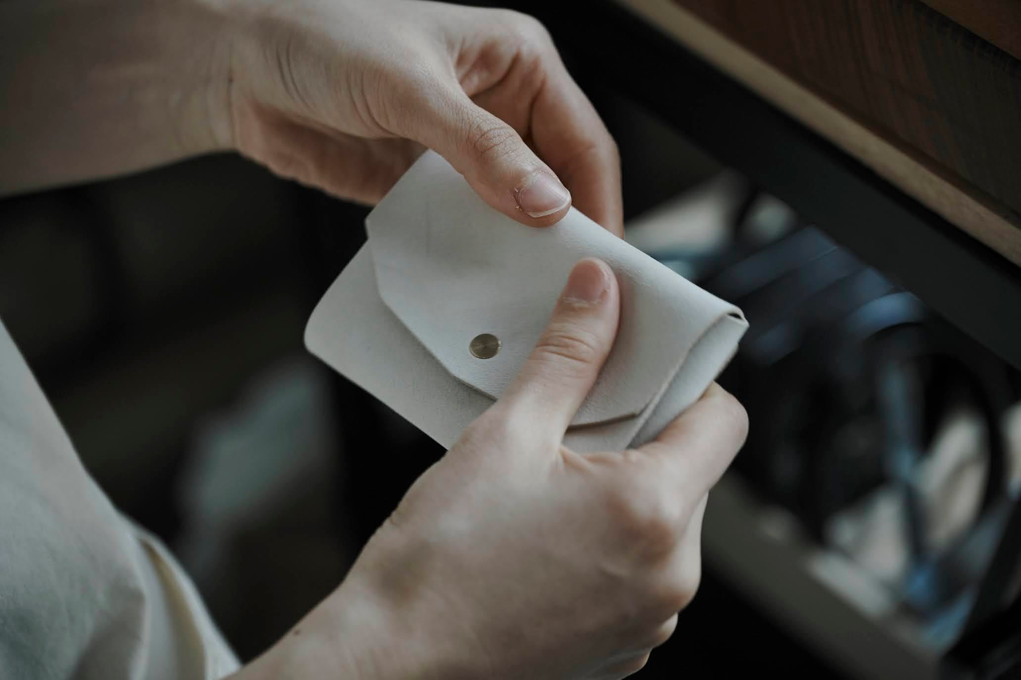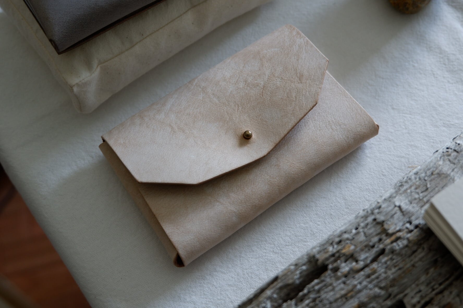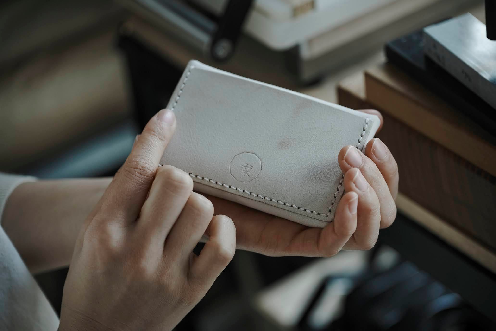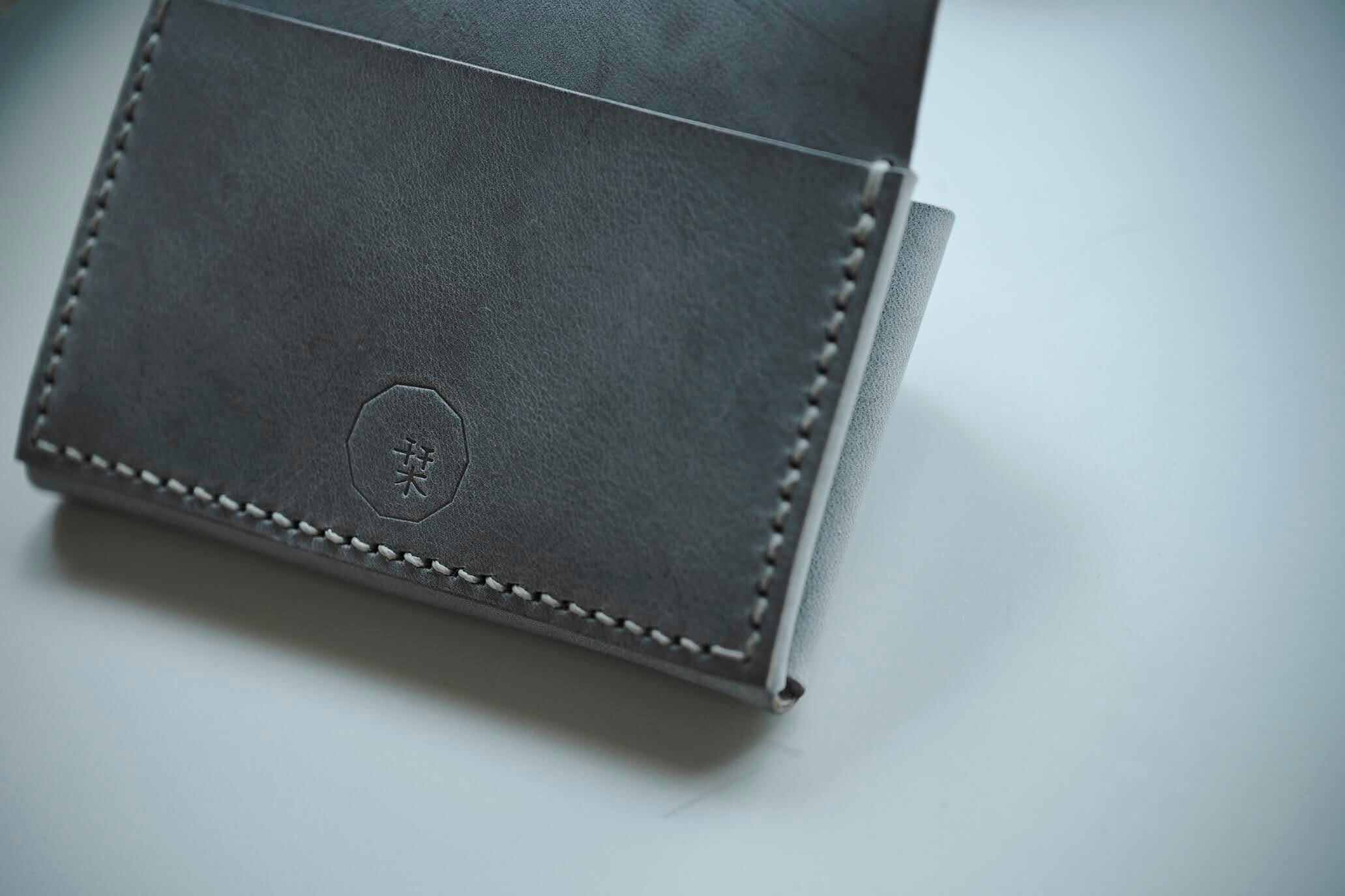 革の仕事を始めた頃、自分の顔にもなる名刺入れを製作しようと試行錯誤し、たどり着いたのがこの形でした。